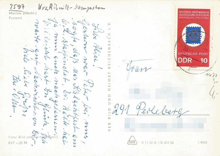 heute möchte ich euch nochmal eine großformatige Ansichtskarte des Marlower Postamts zeigen. Gestempelt wurde die Karte am 28.01.1970 mit dem Stempelgerät MARLOW 2597 c.