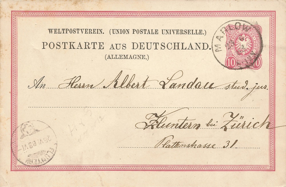 Empfänger war ein Albert Landau, Student der Rechtswissenschaften. Versendet wurde die Postkarte von (oder in dessen Auftrag?) M.Prollius (vielleicht ja Max von Prollius der ebenfalls Jurist war?), seines Zeichens "Rittergutsbesitzer" in Kölzow nahe Marlow. Die Familie Prollius baute um 1825 in Kölzow auf einem 1805 erwobenen Grundstück das Landhaus Schloss Kölzow. Heute ist das Haus wieder im Besitz der Familie von der Lühe, die das Grundstück und ein Gutshaus bis 1768 besaßen, und dient als Hotel. Die Familie von Lühe besaß übrigens auch ab 1450 die Besitzung Marlow.
