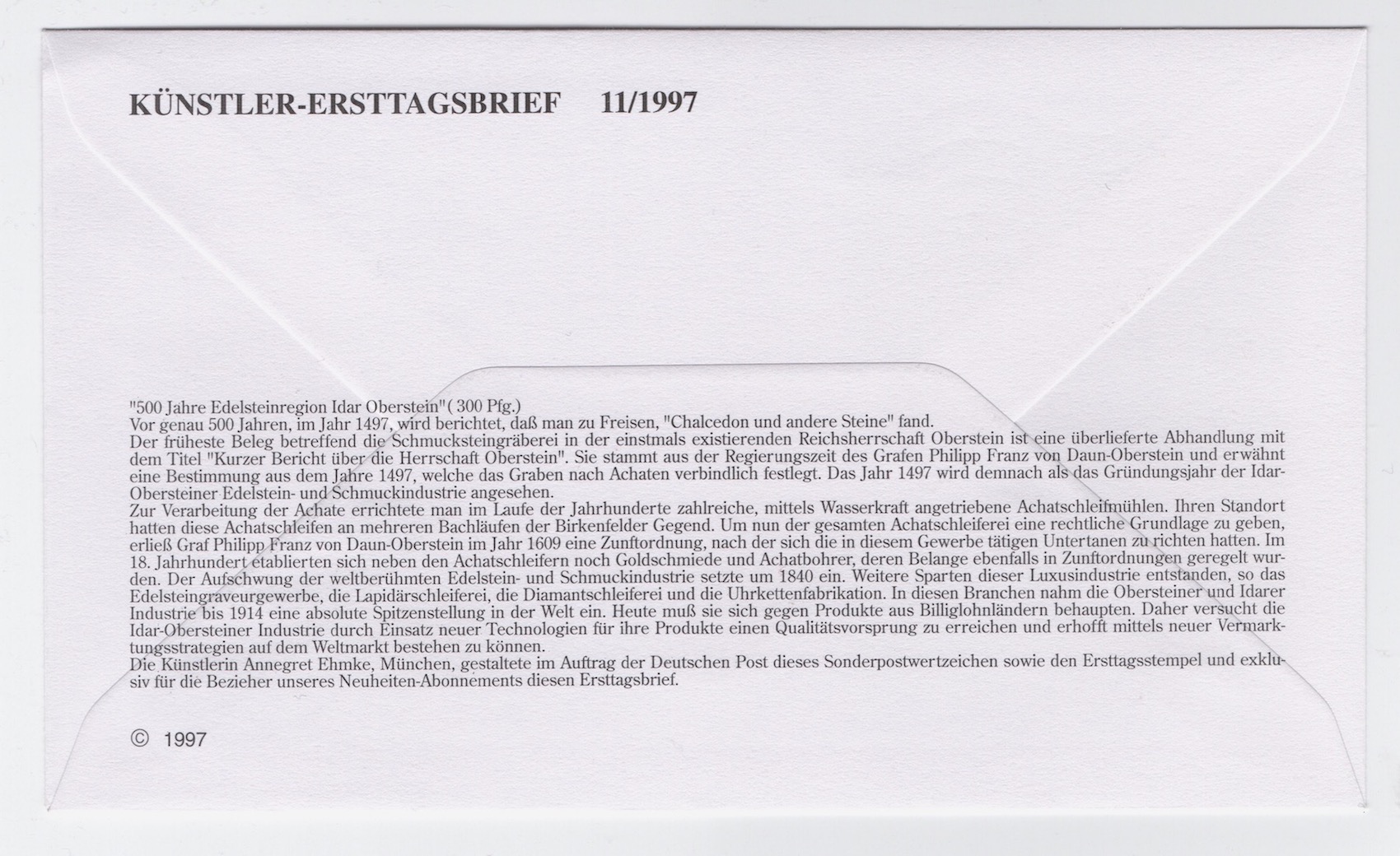 Anbei zwei FDC zu "500 Jahre Edelsteinregion Idar-Oberstein" Dies bezieht sich nur auf den Beginn des Edelsteinabbaues. Rückseitig auf einem der Cover zu lesen.