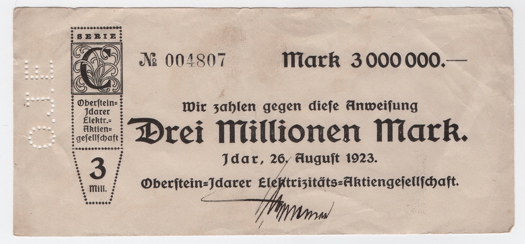 3. Notgeld Oberstein-Idarer Elektrizitäts-Aktiengesellschaft - Drei Millionen Mark - 1923