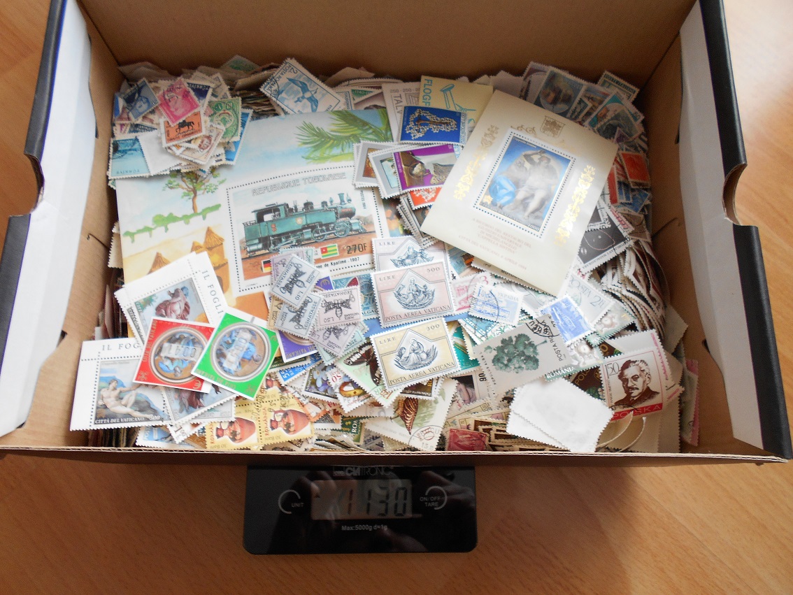 Ich habe die letzte Zeit alle papierfreien Marken, die für mich uninteressant sind, da nicht mein Sammelgebiet oder Doppelt in einem Schuhkarton gesammelt. Jetzt ist der Schuhkarton fast voll und wiegt mit den Marken 1,13kg. Nun wird er verkauft und in einem neuen Karton weiter gespart ![]()