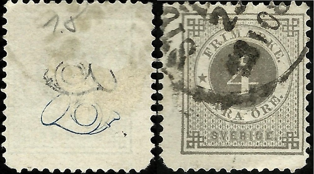 das Eigentliche ist, dass beide Posthornaufdrucke verschiedene Farben sind. Der blaue Aufdruck ist der Richtige. Für den schwarzen kommt mir nur der Gedanke, dass die Marke in einem Vordruckalbum klebte und der Schwarze Posthornsymbol vom Album auf die Rückseite der Marke gelang.