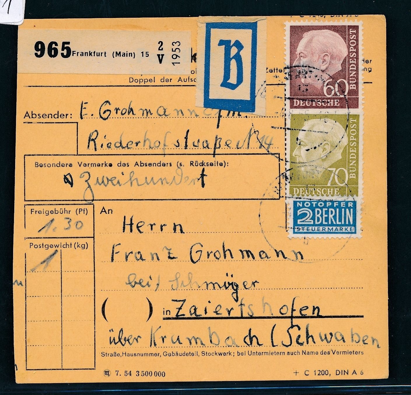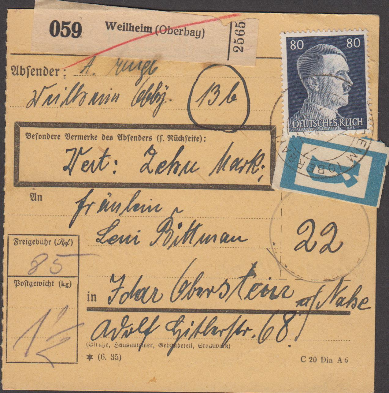Diese seltsame Vignette mit einem großen „B“ darauf fand ich beim letzten Tauschtag auf einer Paketkarte von Weilheim (Obb.) nach Idar Oberstein. Im Internet findet man nach einiger Suche auch den Verwendungszweck dieses „Beutelstückes“.