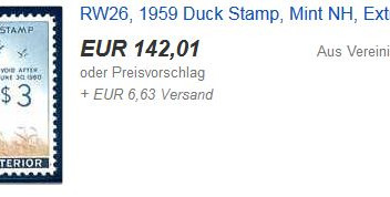 Wenn man bei Ebay unter der Rubrik Briefmarken "hunting stamp" oder duck stamp" eingibt, findet man einige im Angebot, die ohne Unterschrift sind wirklich oft nicht billig, das unterscheidet man wohl auch in postfrisch oder gebraucht (mit Unterschrift).