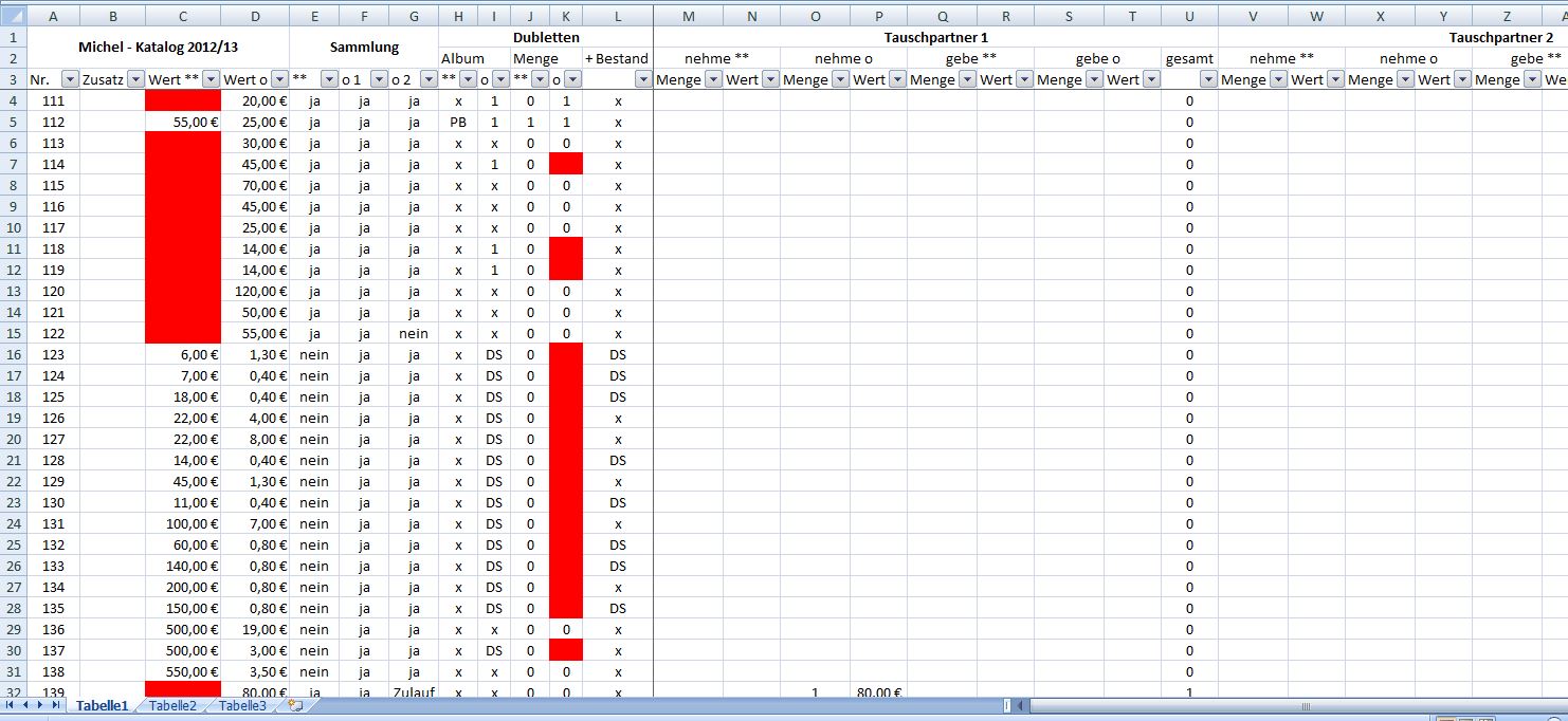 Hallo!In Excel kein Problem. Ich würde allerdings nur EINE Liste anlegen. Nie Daten mehrfach ablegen, das ist nur eine Fehlerquelle. Am Anfang 3 Spalten "Bestand", "Dubletten", "Fehlliste". In die jeweils die Anzahl der Marken die du hast/suchst. Dann den Autofilter rein und mit einem Klick hast du aus deiner Gesamtliste eine Bestands-, Dubletten- oder Fehlliste gemacht.