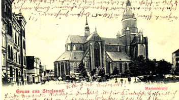 Die erste Karte zeigt die Marienkirche, deren Kirchturm man auch heute noch zu Fuß ersteigen kann. Vom 104 Meter hohen Turm der Marienkirche bietet sich ein Blick über Stralsund, die Umgebung und Rügen. Die Kirche gilt als ein Meisterwerk der der Spätgotik im mitteleuropäischen Raum. Es war von 1549 bis zur Zerstörung seiner damaligen, nach ungesicherter Überlieferung 151 Meter hohen gotischen Spitze durch Blitzschlag 1647 angeblich das welthöchste Bauwerk.