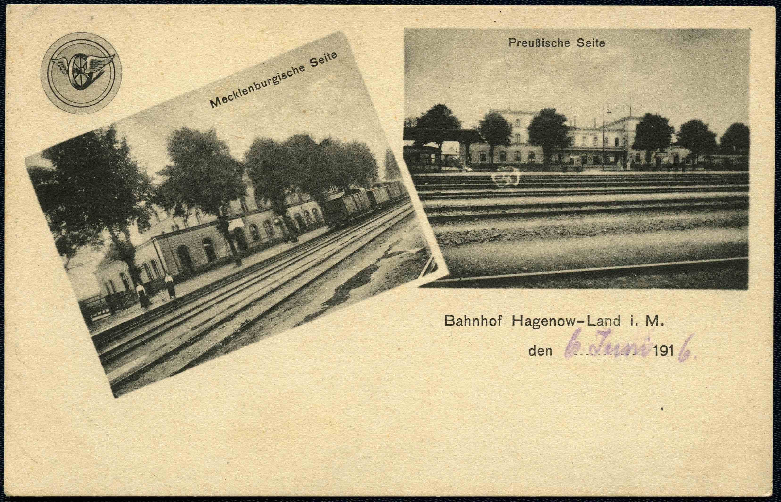 Weiter geht es mit einer Ansichtskarte aus der Stadt Hagenow, welche verschiedenen Ansichten des Bahnhofs Hagenow-Land zeigt. Verwendet wurde diese Karte im Jahr 1916.