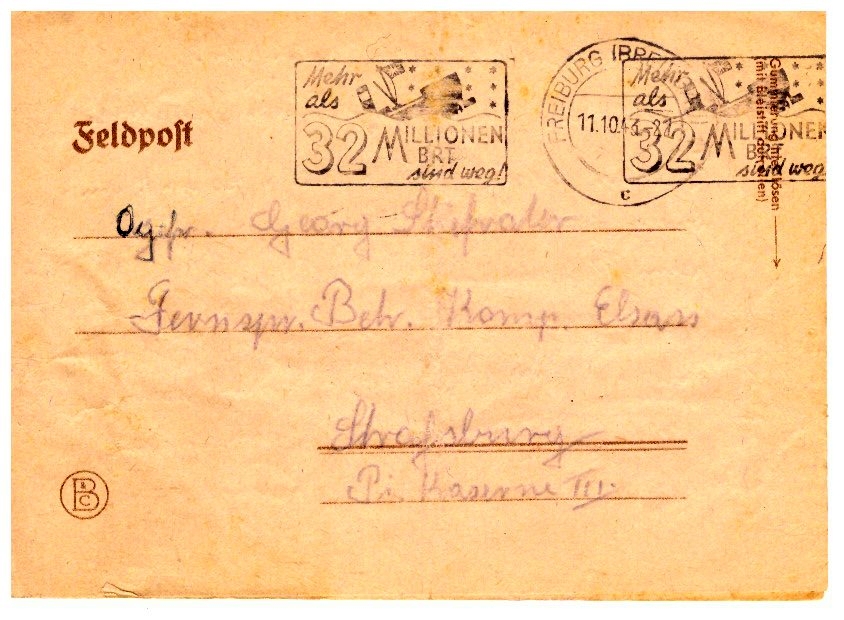 Wie dem auch sei: Hier zunächst ein anderes Exemplar des selben Stempels auf einem Feldpostbrief von Freiburg nach Straßburg vom 11.10.43 , mit einem doppelten Abschlag der Stempelmaschine.