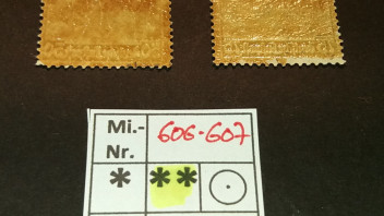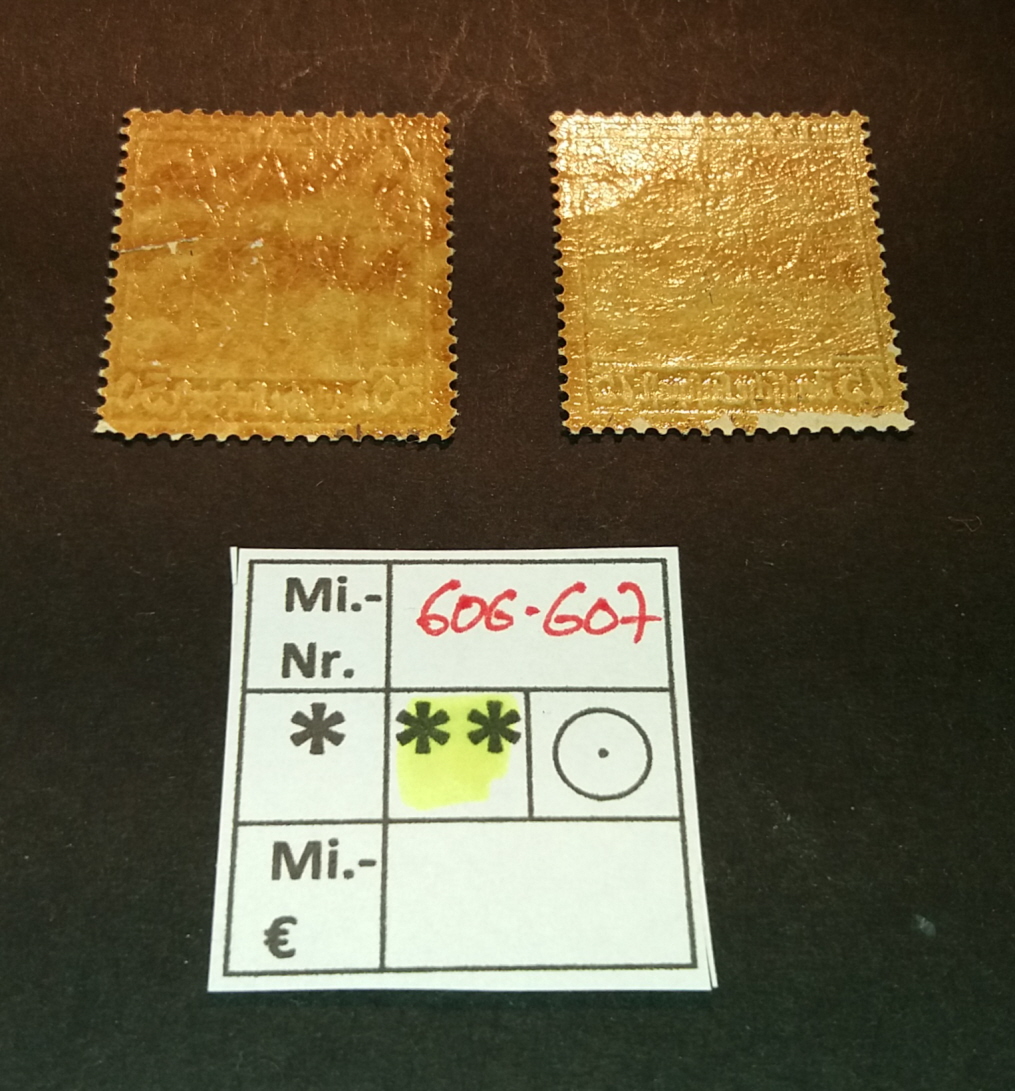 Die Mi.-Nummern DR 606-607 haben eine schwefelsäurehaltige Gummierung. Eine Entfernung des Gummis wird im Michel empfohlen.