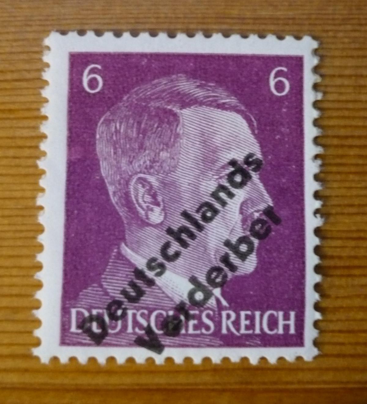 Beim Sortieren habe ich die Mi 782 mit Aufdruck "Deutschlands Verderber" gefunden. Der Wert der Marke ist 3 Pfg in dunkelgelbbraun.