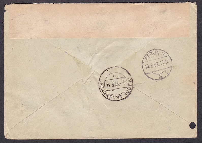 Ich bin im Forum nicht so recht fündig geworden, was die Köpfe I und II Serie angeht, daher führe ich Deinen Thread fort. Anbei zeige ich einen m.E. korrekt frankierten Fernbrief, der per Express von Wurzen nach Frankfurt/Oder versandt wurde. Der Brief hat einige Besonderheiten zu bieten. Die Frankatur mit 13 acht Pfennig Marken ist sicherlich eine davon. Auch wenn die eine oder andere Marke beschädigt ist, ein interessantes Exemplar. Die Papiernot der damaligen Zeit drückt sich darin aus, dass auf den Briefumschlag ein Vorblatt geklebt wurde, auf das dann Anschrift und Frankatur kam. Unter diesem Vorblatt habe ich eine Altfrankatur mit einer 16 Pfennigmarke als Behördenpost gefunden - natürlich ist diese Marke schwer beschädigt. Was mich jetzt hauptsächlich interessiert, ist, ob es sich am 9.3.1953 schon um Köpfe II handelt oder um Marken der Köpfe I Serie. Also ist es möglich an Hand der Stempeldaten eine Unterscheidung zu treffen oder hilft nur eine WZ-Prüfung. Und wenn eine WZ-Prüfung erforderlich ist, wie kann diese an einem solchen Beleg durchgeführt werden.