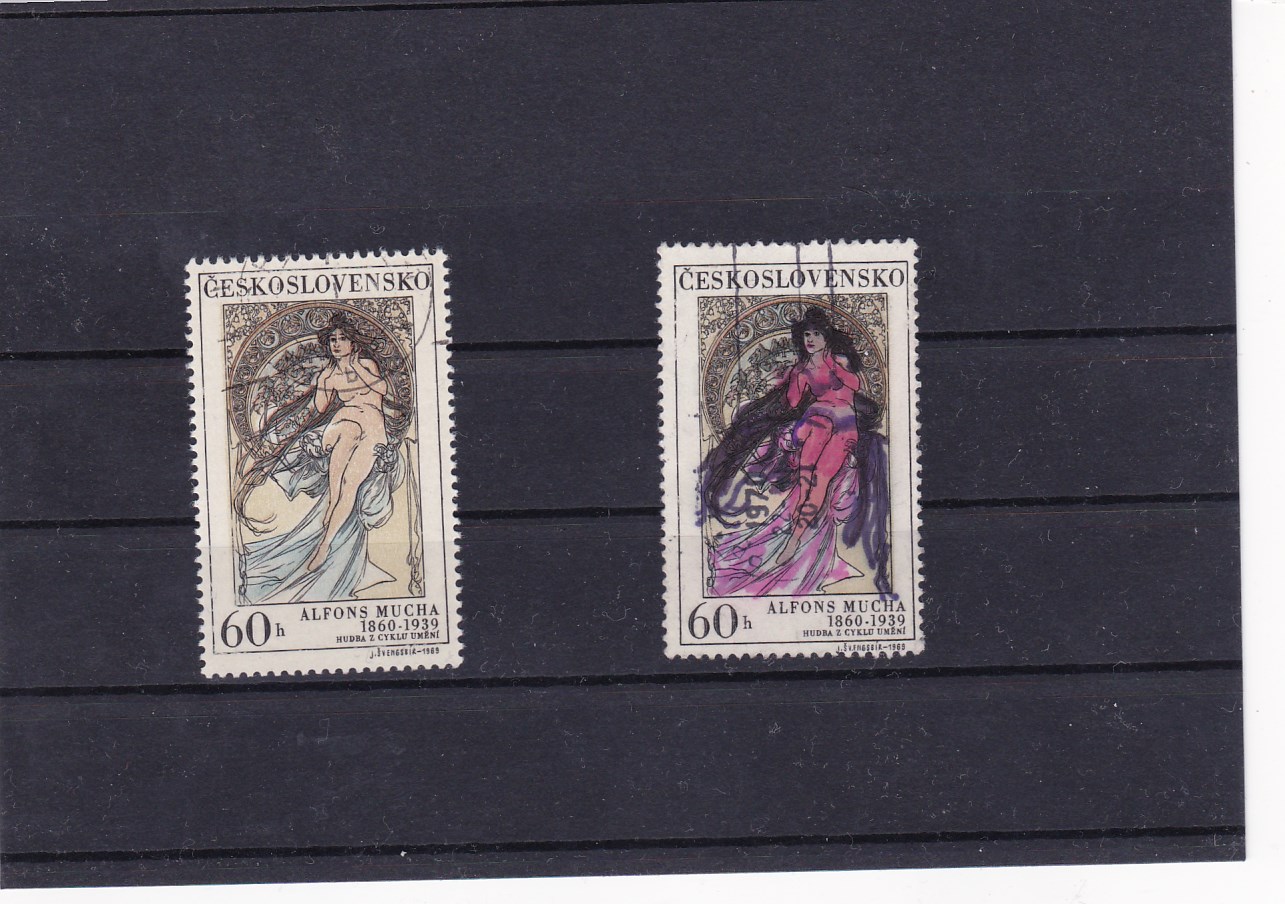 Da wollte wohl ein Hobbymaler unter den Sammlern eine Mucha-Zeichnung mit mehr Farbe verbessern, hat sie aber mehr verschlimmbessert. Oder der Vater hat dem nörgelnden Kind eine Marke zum Ausmalen gegeben, damit es Ruhe gibt.