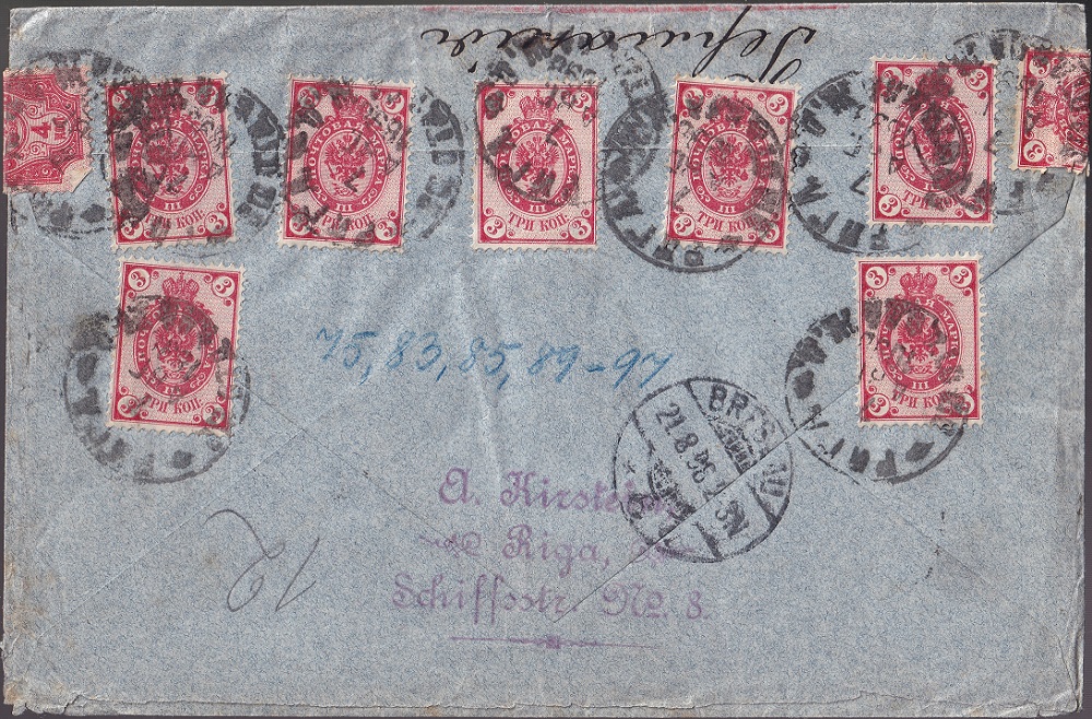 Sehr schöne 40-Kopeken-Frankatur aus Riga nach Breslau, bestehend aus 1x 40x und 12x 47x. Zwei Marken wurden sogar zum Verschluss des Briefes umgeknickt.