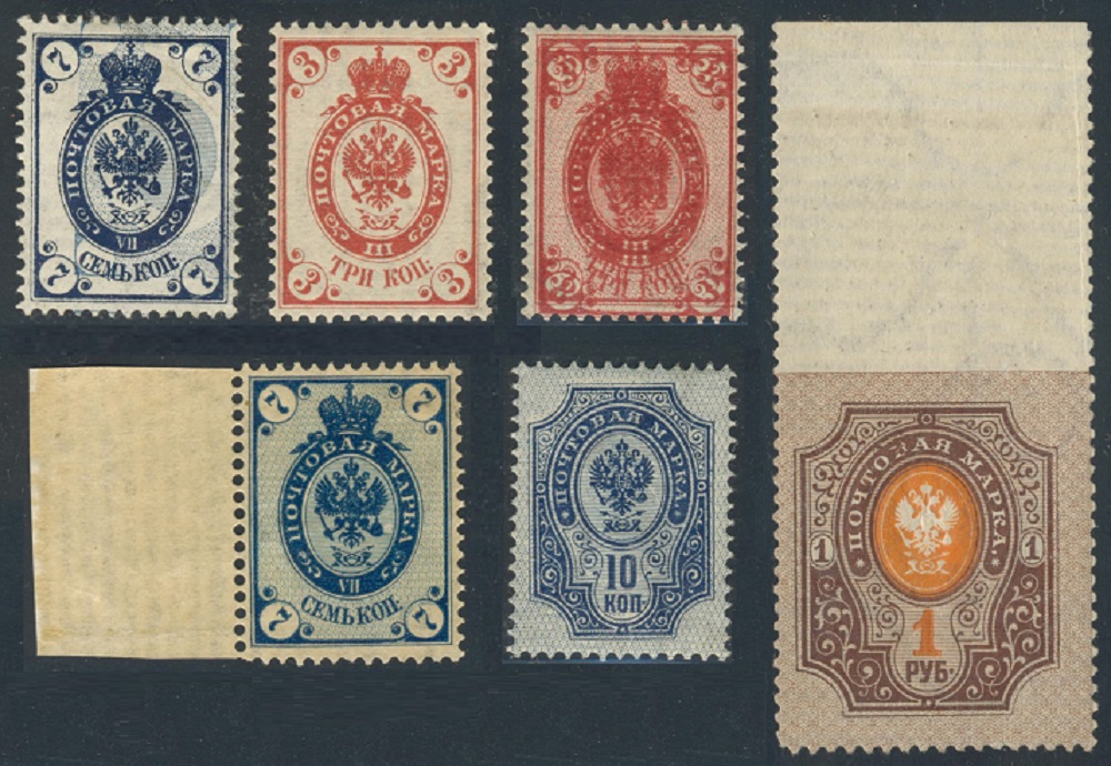 Ausgegeben wurden am 2. Mai 1889 zunächst die Werte zu 4 Kop., 10 Kop., 20 Kop. und 50 Kop. sowie der 1-Rubel-Wert je auf waagerecht gestreiften Papier. Am 14.12. folgten dann die Kopekenwerte zu 1, 2, 3, 5, 7 und 14 sowie die 3,50- und 7-Rubelwerte ebenfalls je auf waagerecht gestreiften Papier. 1892 folgte dann die 35-Kopekenmarke. 1902 - 1904 wurden diese Werte dann auch auf senkrecht gestreiften Papier ausgegeben. Ergänzend kamen die 15- und 25-Kopekenmarke hinzu. Diese beiden gibt es also nur auf senkrecht gestreiften Papier.