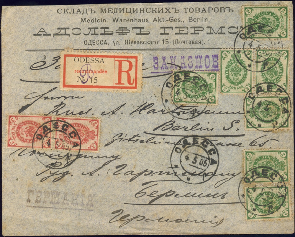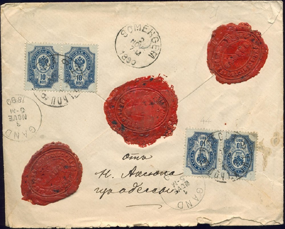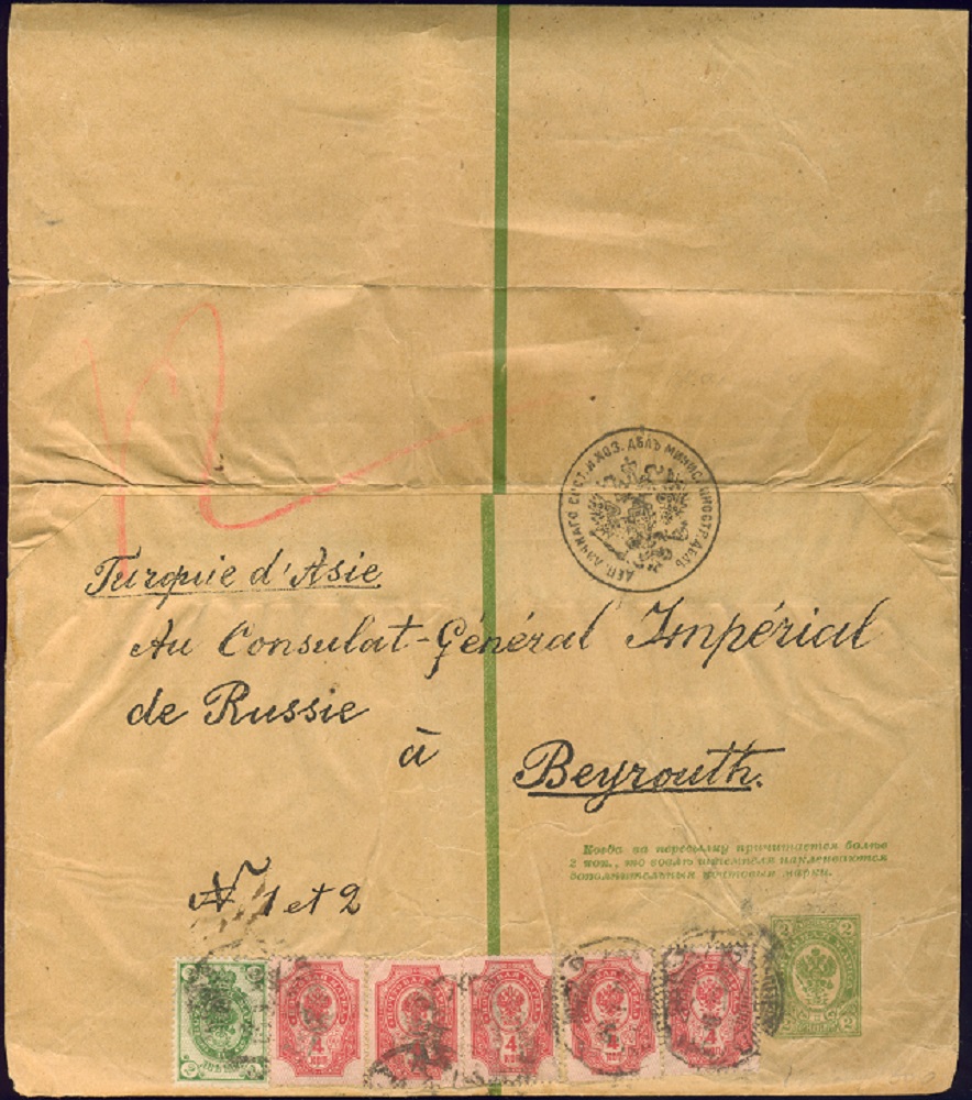 Das Porto (am 1. April 1889 erhöht) setzt sich aus 3x 10 Kop. für den Brief + 10 Kop. für die Einschreibegebühr zusammen. Alle Marken sind auf waagerecht gestreiftem Papier gedruckt. -