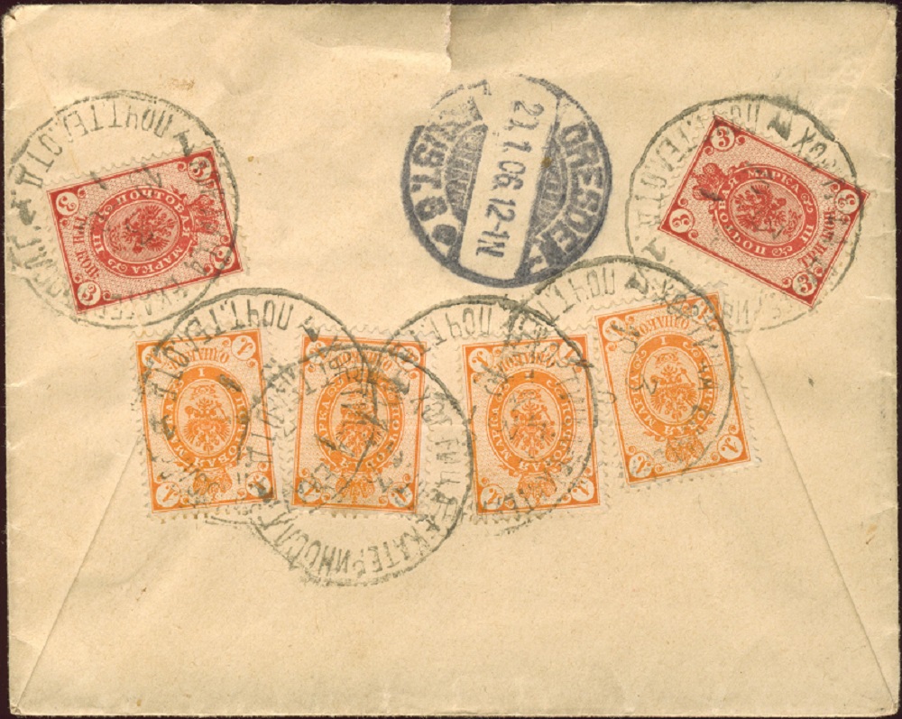 Bei meiner Karte könnten die Brüder in St. Petersburg gewesen sein. Die Stempel sind meines Erachtens alle okay. Hier sind der russischen Post 4 Kopeken entgangen, die wiederum aber die dänische Post als 4 Öre bekam. Aber auch hier wurden die Marken vorher gekauft. Eine doppelte Verwendung liegt in beiden Fällen nicht vor.