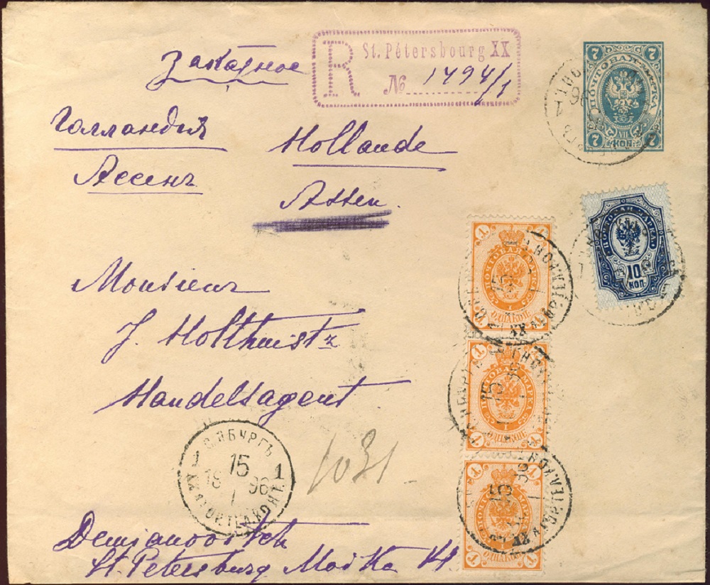 Es handelt sich um eine dänische Postkarte 3 Øre grau (Nr. 17 I) von 1888. Sie wurde hier 1905 als Einschreiben nach Kopenhagen verwendet und ist mit vier 1-Kop.-Marken sowie drei 2-Kop.-Marken (alle y) sowie einer 1-Øre-Marke freigemacht. Das Porto für die Auslandspostkarte betrug 4 Kopeken + 10 Kopeken für das Einschreiben. Dem entsprechend sind die dänischen 4 Øre voll angerechnet worden.Damit wünsche ich allen Frohe Weihnachten und schöne Festtage!