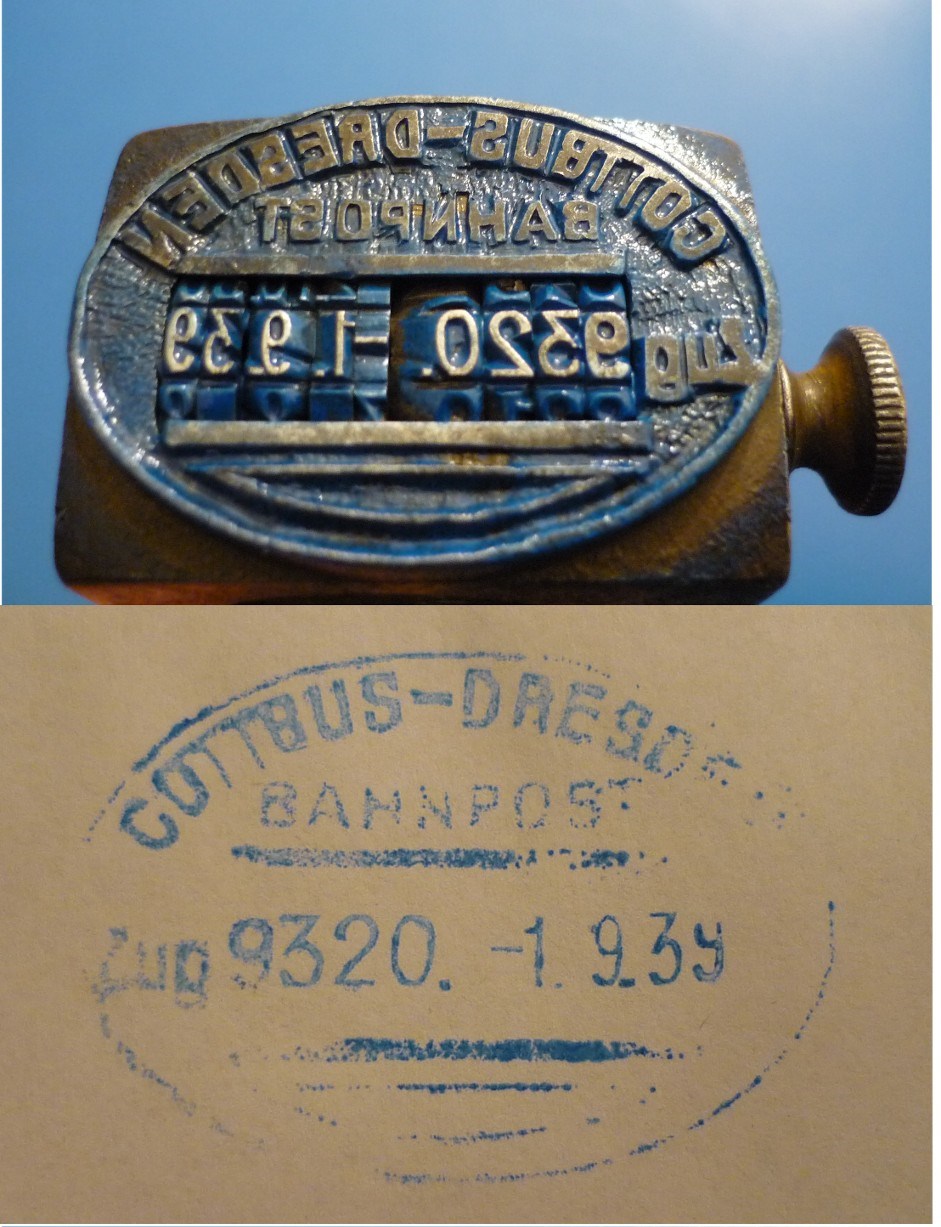 COTTBUS-DRESDEN / BAHNPOST / ZUG 9320. Handstempel / Ellipsenstempel mit Kurzsteg und Segment unten / Bahnpoststempel