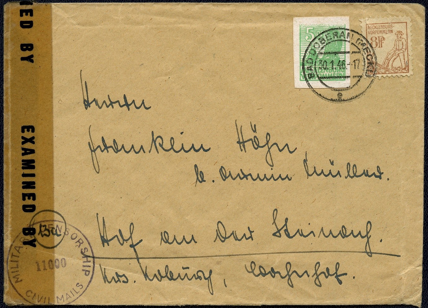 Der folgende Brief wurde mit 0,13 Reichsmark freigemacht und war somit um 0,01 Reichsmark überfrankiert. Aufgegeben wurde er am 30. Januar 1946 auf dem Postamt Bad Doberan.