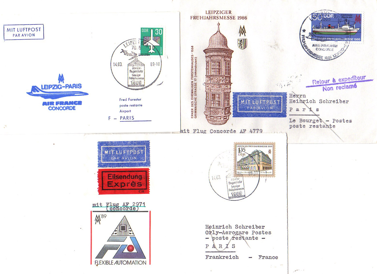 Es gab mehrere Messeflüge der Concorde Leipzig-Paris-Leipzig in den Jahren 1986-1990 ,jeweils zur Frühjahrs-und Herbstmesse,mit amtlicher Postbeförderung-ich müßte noch einige Dubletten vorrätig haben,werde mich wieder per PN melden!