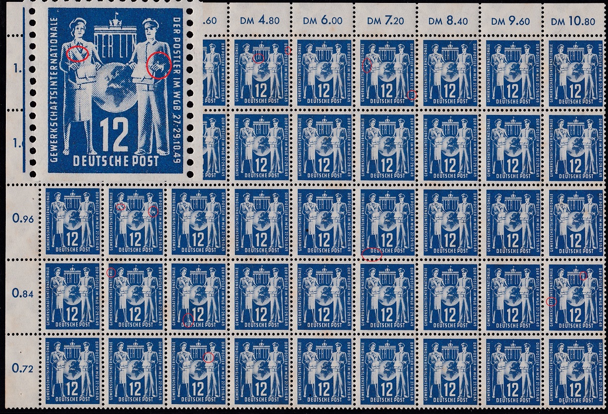 der Strich am U war eigentlich der Grund warum ich auf diesen Block aufmerksam geworden bin. Der Block wurde auch als PF/Abart Strich am U beschrieben/angeboten. Als er aber bei mir angekommen ist habe ich schnell gesehen das es ein Stempel Spritzer ist. Die Farbe des Striches passt zur Stempelfarbe aber nicht zum Schwarz der Buchstaben. 520B Bl 14 p hatte ich vor dem Kauf aber auch schon gesehen.