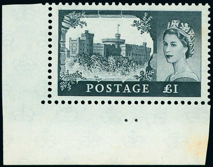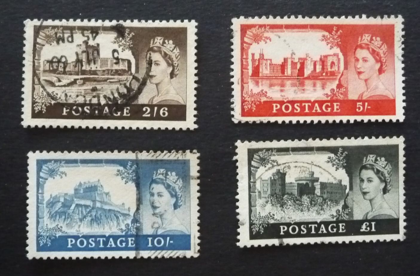 Die ersten drei Marken sind Typ I = De La Rue, die 1-Pfund-Marke Typ II = Bradbury: