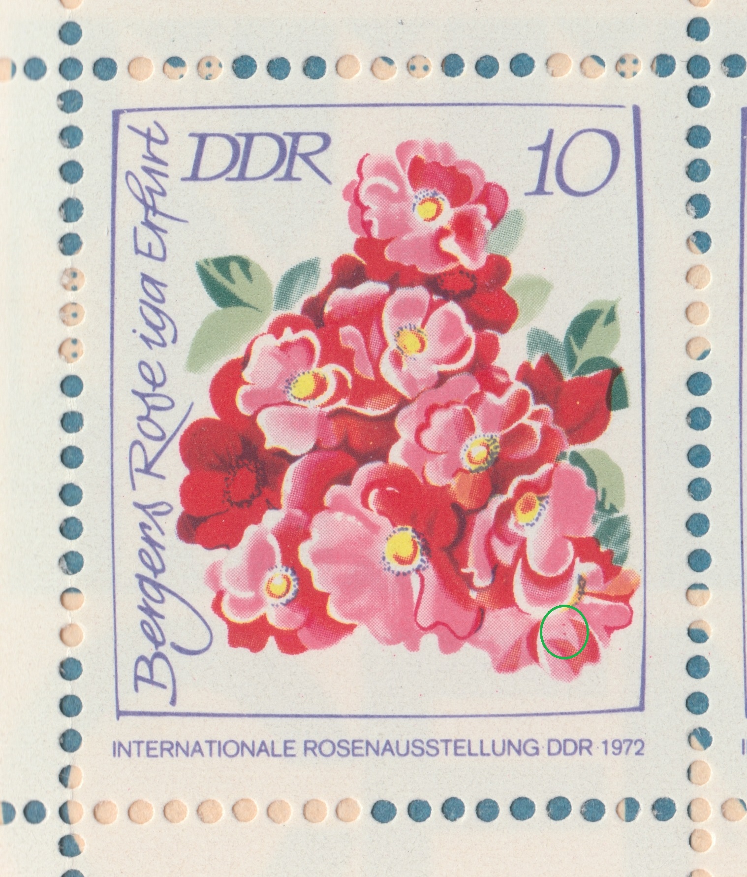 Und dann noch ein kreisförmiger Fehler auf Feld 1 des HBl 14 A, der von der Form her an einen Butzen erinnert. Allerdings werden Butzen durch Fremdkörper verursacht, die dann meist in der Mitte des Flecks ihre Spuren hinterlassen. Hier sieht man aber in der Mitte noch die originale Rasterung, es handelt sich also nur um einen fast ringförmigen Ausfall von Rasterpunkten: