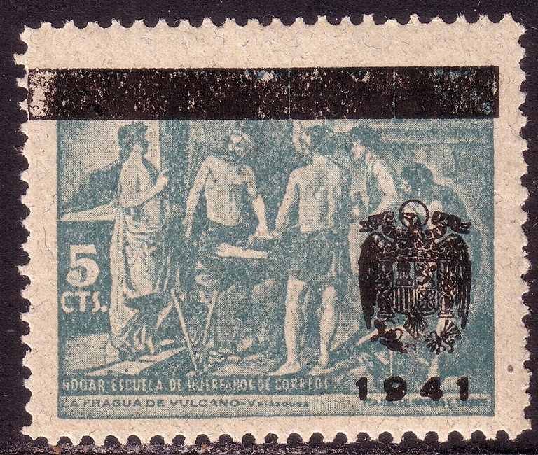 Die Marke wurde ca. zwischen 1931 - 1939 verausgabt und 1941 von der Franco-Regierung überdruckt. Hinter dem Balken steht: Republica Espanola. Die Marke zeigt das Gemälde von Diego Velazquez: Apollo in der Schmiede des Vulcan, das in einem Museum in Madrid hängt.