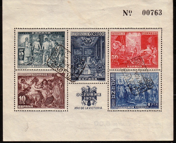 Die Marke wurde ca. zwischen 1931 - 1939 verausgabt und 1941 von der Franco-Regierung überdruckt. Hinter dem Balken steht: Republica Espanola. Die Marke zeigt das Gemälde von Diego Velazquez: Apollo in der Schmiede des Vulcan, das in einem Museum in Madrid hängt.