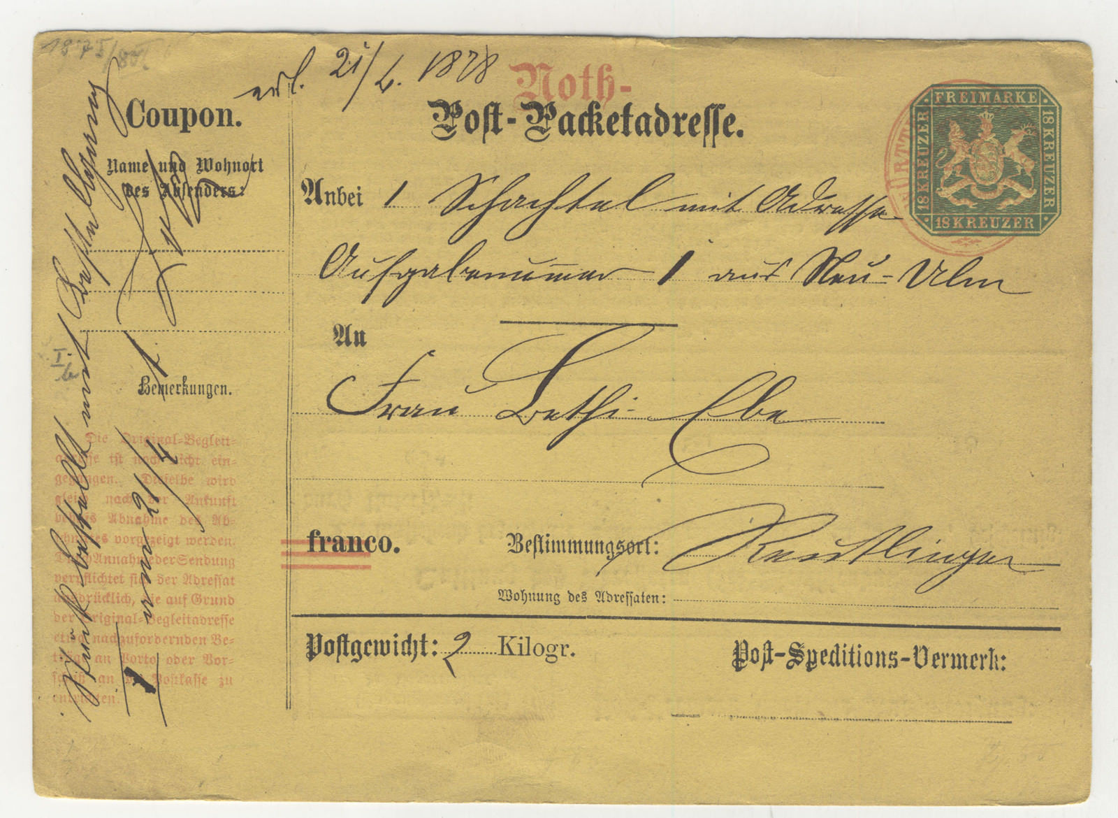 das ist ein ausgeschnittener Wertstempel einer württembergischen Paketkarte von 1874, siehe Michel Ganzsachen-Katalog, Pkt. 1