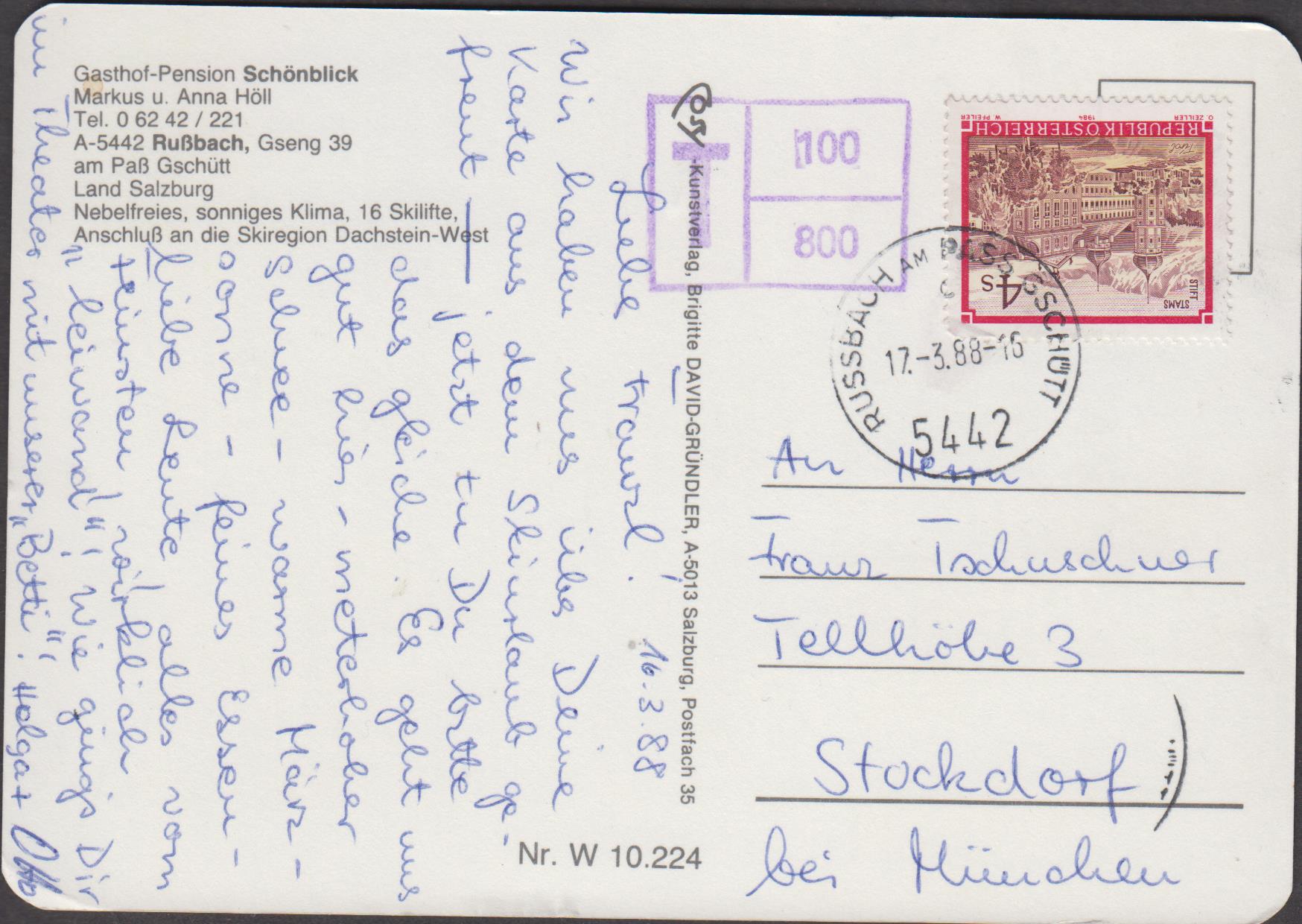 Diesen seltsamen Stempel fand ich auf einer Ansichtskarte von 1988, die von Russbach am Pass Gschütt nach Stockdorf bei München gesandt wurde.