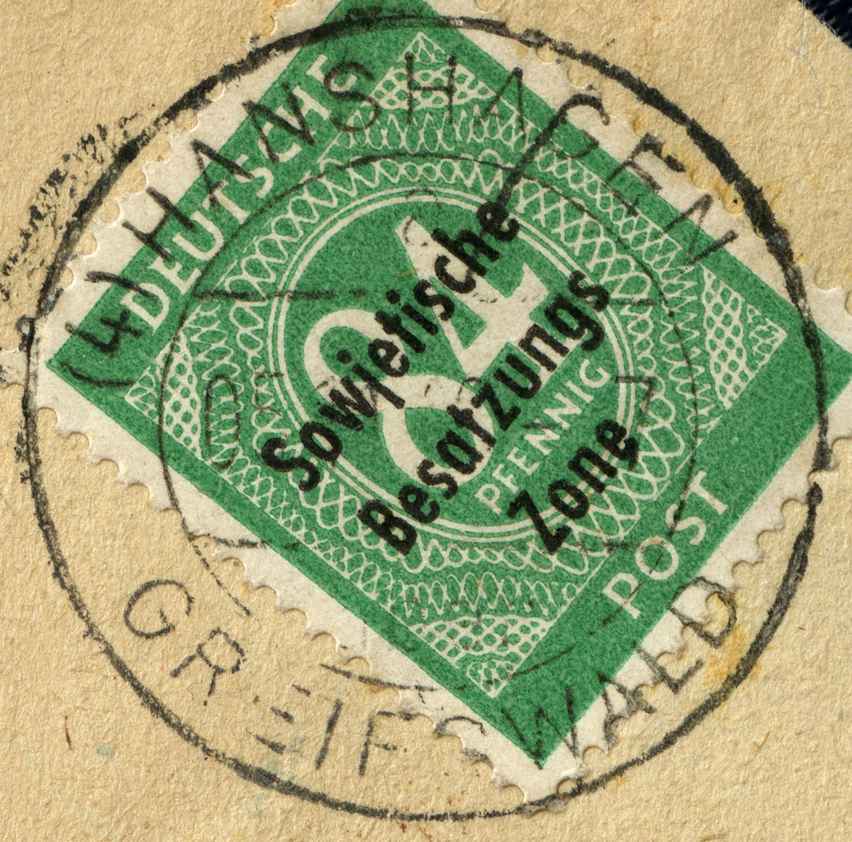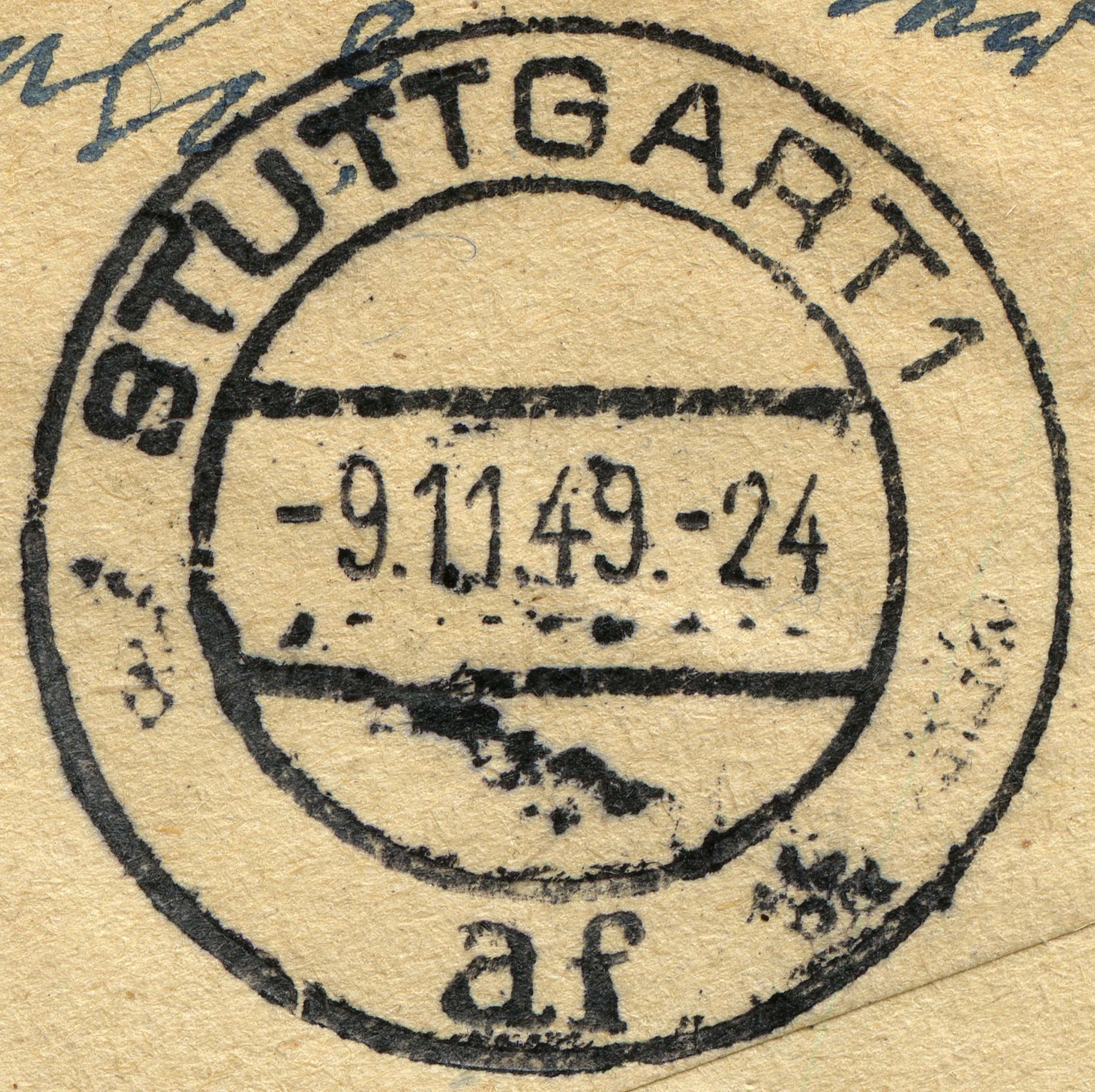 - wahrscheinlich aptiertes Stempelgeräte - Ortsbezeichnung "STUTTGART 1" ist asymmetrisch angeordnet und die Unterscheidungsbuchstaben "af" weisen eine abweichende Schriftart auf