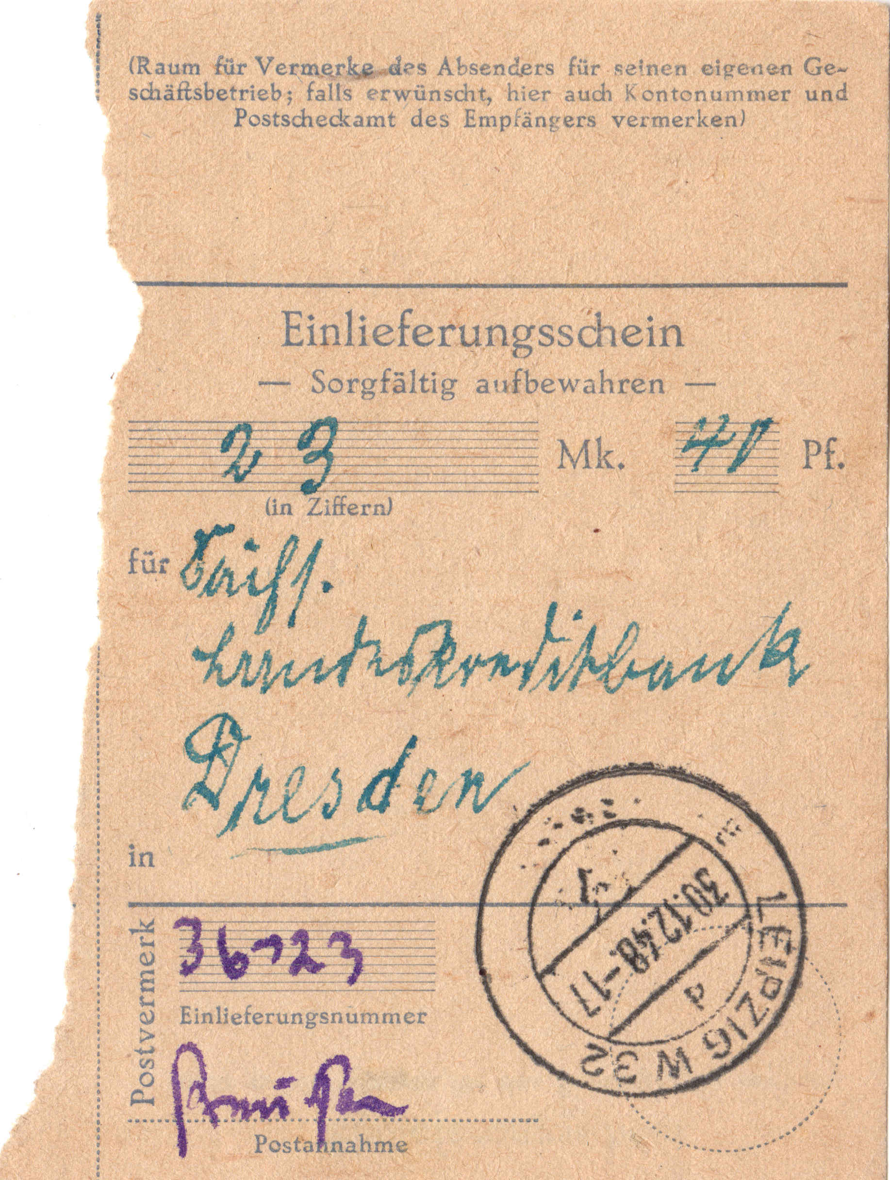 Als erstes ein Einlieferungsschein über 23,40 Mark. Die Einzahlung erfolgte auf dem Postamt W 32 für ein Konto der Sächsischen Landeskreditbank in Dresden. Der Quittungsteil wurde mit einem aptierten Stempel Kb d abgeschlagen.