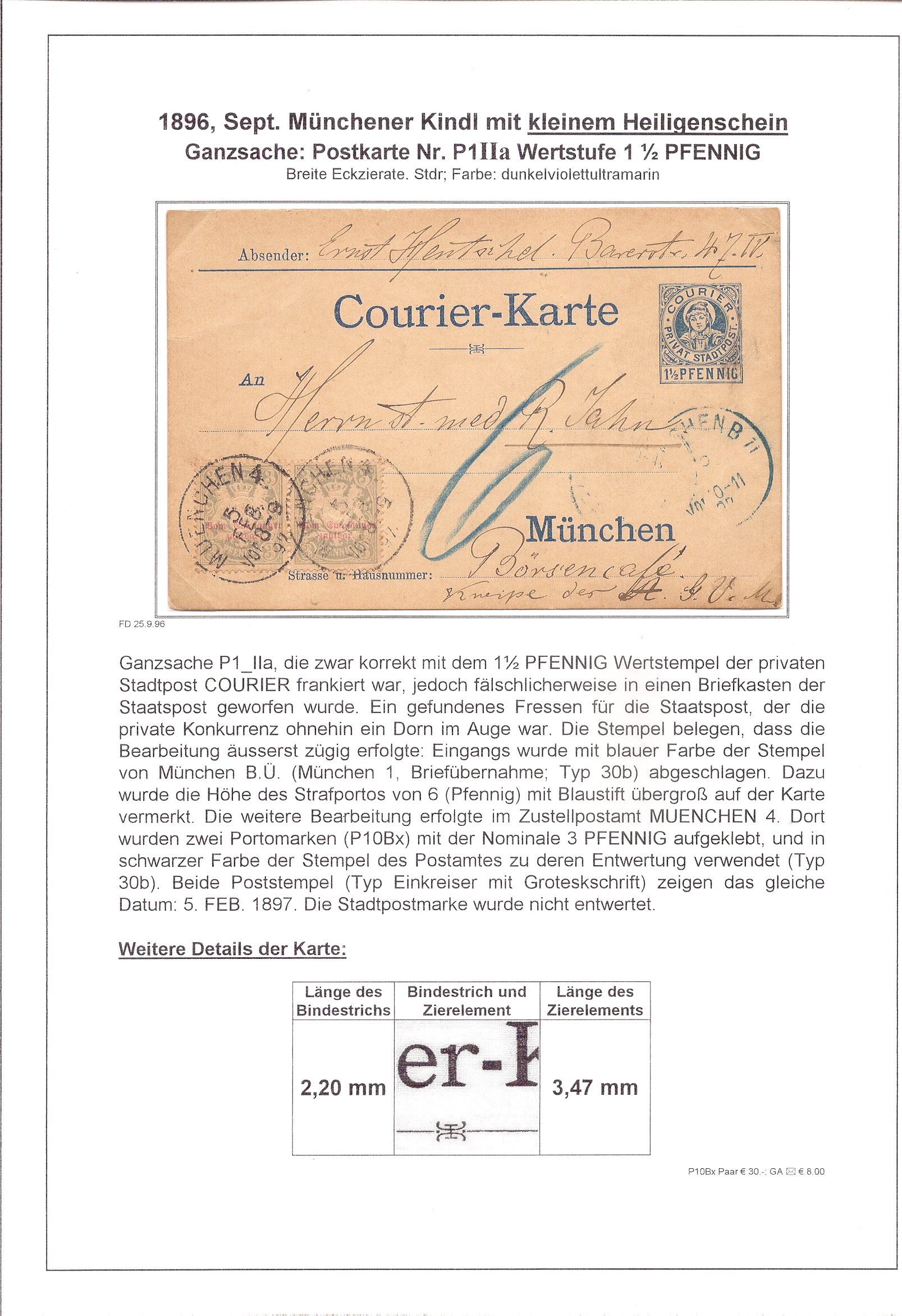 Und nicht nur anhand der fehlenden Zeitangabe kann man auf die Überlastung des Privatpostpersonals schließen. Die Entwertungsstempel hatten noch ein kleines Unterscheidungsmerkmal: München hatte ein sechszackigen Stern und Nürnberg eine fünfzackigen Stern (Davidstern und Pentagramm). Offensichtlich haben die Nürnberger COURIER-Bureaus den Münchener Kollegen ihre nicht dringend benötigten Stempel ausgeliehen. Spezialisten suchen derartige klar lesbare Fremdabschläge.