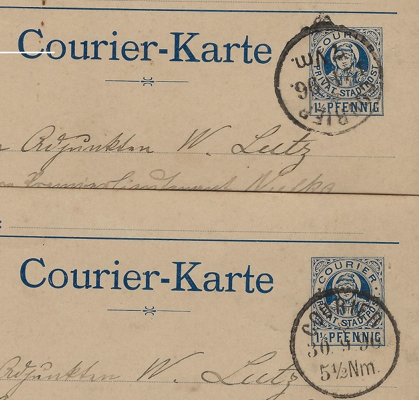 Mein Neuzugang zur Nürnberger Privatpost COURIER ist eigentlich nichts Besonderes. Ich trinke aber, wenn mich die philatelistische Muse küsst, gerne ein Gläschen Wein dazu. Aber der private Stempel auf der Rückseite einer Nürnberger Ganzsachenkarte hat mich "angemacht"!