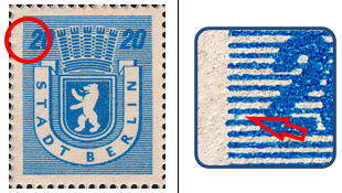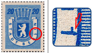 Dann mal ein "theoretisch" einfacherer Bogen. Die 6 A - 20 Pfg.-Marke »Berliner Stadtwappen mit Schriftband«. Es gibt vier Schalterbögen mit drei Auflagen und nur Papier »w«. Jedoch wurden nach der Auflage II die Platten "geputzt". Damit sind viele Fehler in Auflage III nicht dabei, aber es sind auch neue hinzugekommen.