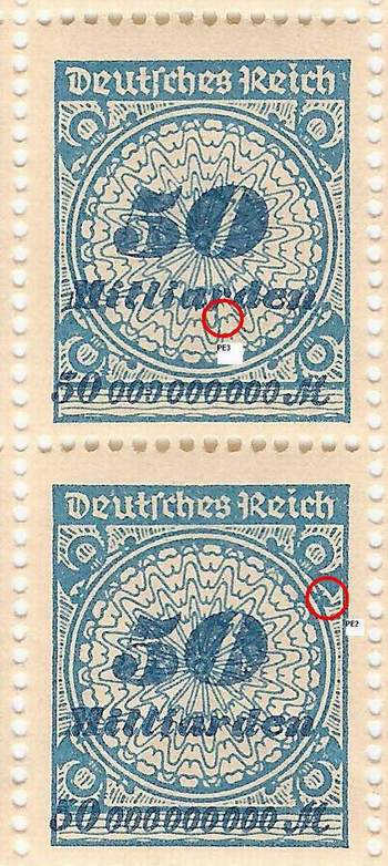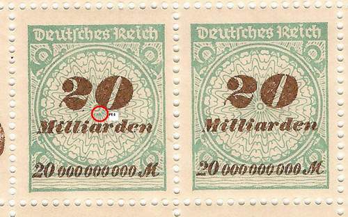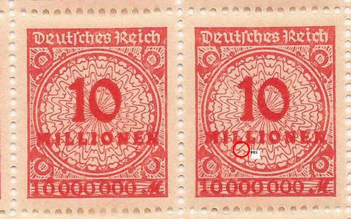 Solche Fehler treten bei den Überdruck-Marken der Hochinflation relativ häufig auf. Allerdings überwiegend bei postfrischen Marken, die fast alle aus der Makulatur stammen. Das ist auch der Grund, warum gestempelte Stücke kaum einmal zu finden sind. Das Zustandekommen solcher Fehler liegt darin begründet, dass die Druckplatte aus mehreren Klischeeblöcken zusammengesetzt war und an diese die Randdrucke angefügt wurden, also auch die Reihenwertzahlen. Wenn diese „Anfügung“ nicht präzise erfolgte und zu nahe ans Markenbild zu liegen kam, ergaben sich solche Fehler. Ein begehrenswertes Stück für jede Abartensammlung."