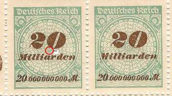 Solche Fehler treten bei den Überdruck-Marken der Hochinflation relativ häufig auf. Allerdings überwiegend bei postfrischen Marken, die fast alle aus der Makulatur stammen. Das ist auch der Grund, warum gestempelte Stücke kaum einmal zu finden sind. Das Zustandekommen solcher Fehler liegt darin begründet, dass die Druckplatte aus mehreren Klischeeblöcken zusammengesetzt war und an diese die Randdrucke angefügt wurden, also auch die Reihenwertzahlen. Wenn diese „Anfügung“ nicht präzise erfolgte und zu nahe ans Markenbild zu liegen kam, ergaben sich solche Fehler. Ein begehrenswertes Stück für jede Abartensammlung."