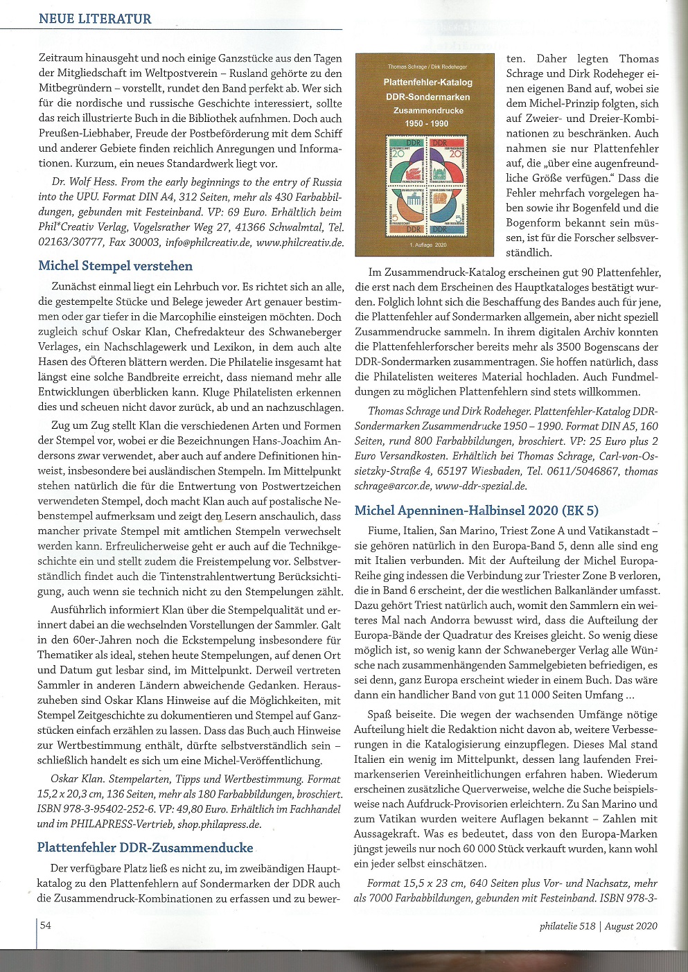 In der philatelie Juli 2022, S. 55 wird über die zweite Auflage des Kataloges, den Thomas Schrage und Dirk Rodeheger von der Forschungsgemeinschaft DDR-Plattenfehler vorgelegt haben, informiert. Es handelt sich im den Teil I von 1949 - 1969 mit ca. 500 neu aufgenommenen Plattenfehlern. Der Umfang liegt jetzt bei gut 300 Seiten. Besonders wird hervorgehoben, dass zu den Blockausgaben Erweiterungen stattgefunden haben.