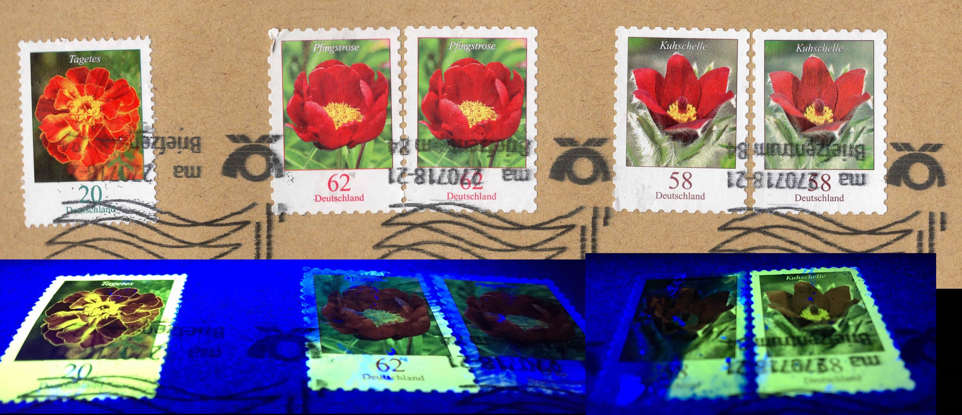 Was jetzt auffällt, die Marken haben stellenweise überhaupt keine UV reflektierende Schicht mehr. Es fällt bei der Linken Kuhschelle auch unter UV Licht eine hellere Stelle auf, hier ist das Papier dünner. Dies kann bei einer selbstklebenden Marken so eigentlich nicht passieren.