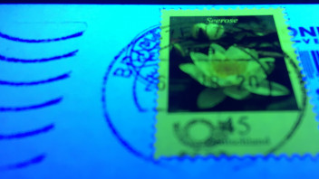 Diese Anzeichen beschlichen mich dann darin, dass hier wohl Marken abgelöst und wiederverwendet wurden. Also packte ich meine UV Lampe aus denn durch das ablösen, wird zwar die UV Schicht nicht mit „abgewaschen“, die Marken leuchten unter UV Licht nach wie vor, aber gegebenenfalls etwas „matter“ und nicht mehr so „satt“.