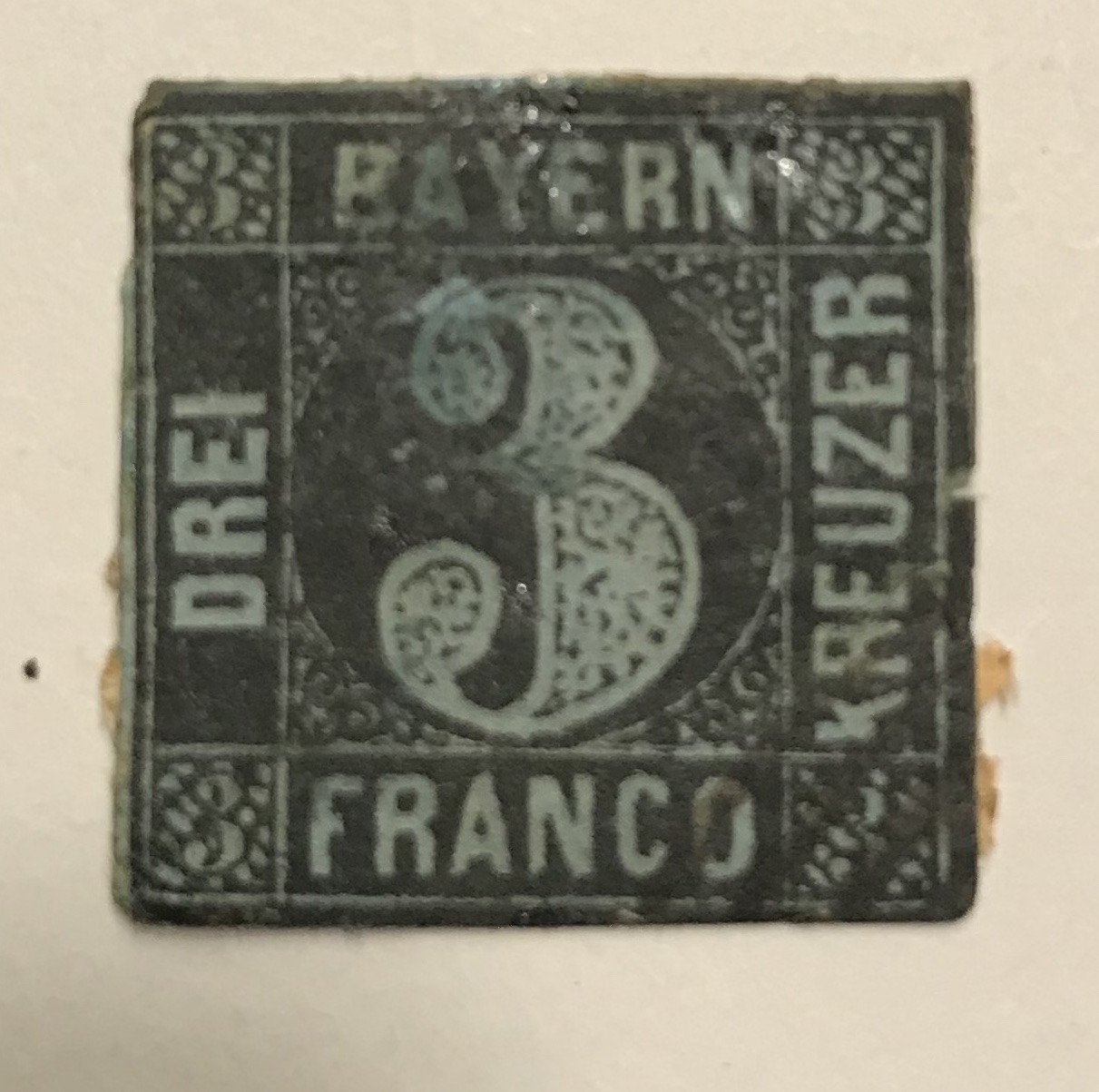 Eine dieser Marken ist eine stark reparierte 3 Kreuzer Marke in schwarz.
