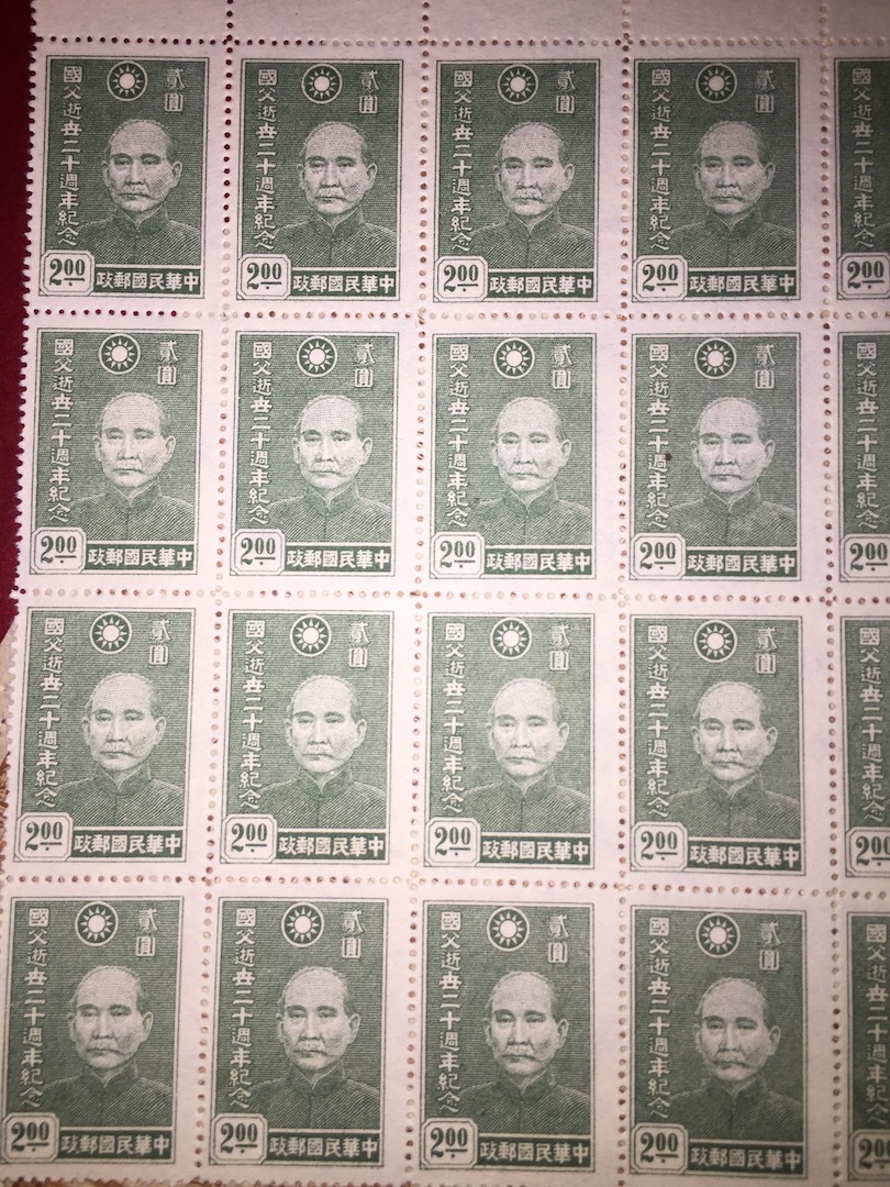 einige Bögen scheinen sogar vollzählig zu sein, heißt dass hier ein kompletter? Bogen mit 90 Marken vorliegt. Bei den Marken von Dr. Sun Yat-sen habe ich sogar Bögen, wo KEINE Prägungen zu erkennen sind. Das betrifft die Marken mit dem Wert 20, 30, 40, 50 und 100 Dollar? (sind es Dollar??)