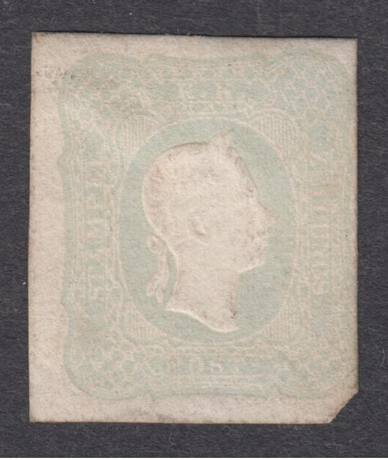 Das erste ist die österreichische Zeitungsmarke Michel-Nr. 23 von 1861. Die gibt es in 5 verschiedenen Farbtönen, als Fußnote schreibt der Katalog: Die sehr lichtempfindliche Farbe kommt in vielen weiteren Tönungen vor. Ob die komplette Farbe dabei auch verschwinden kann und die Marke dannn nur noch weiß ist, so wie hier, davon schreibt der Katalog nichts.