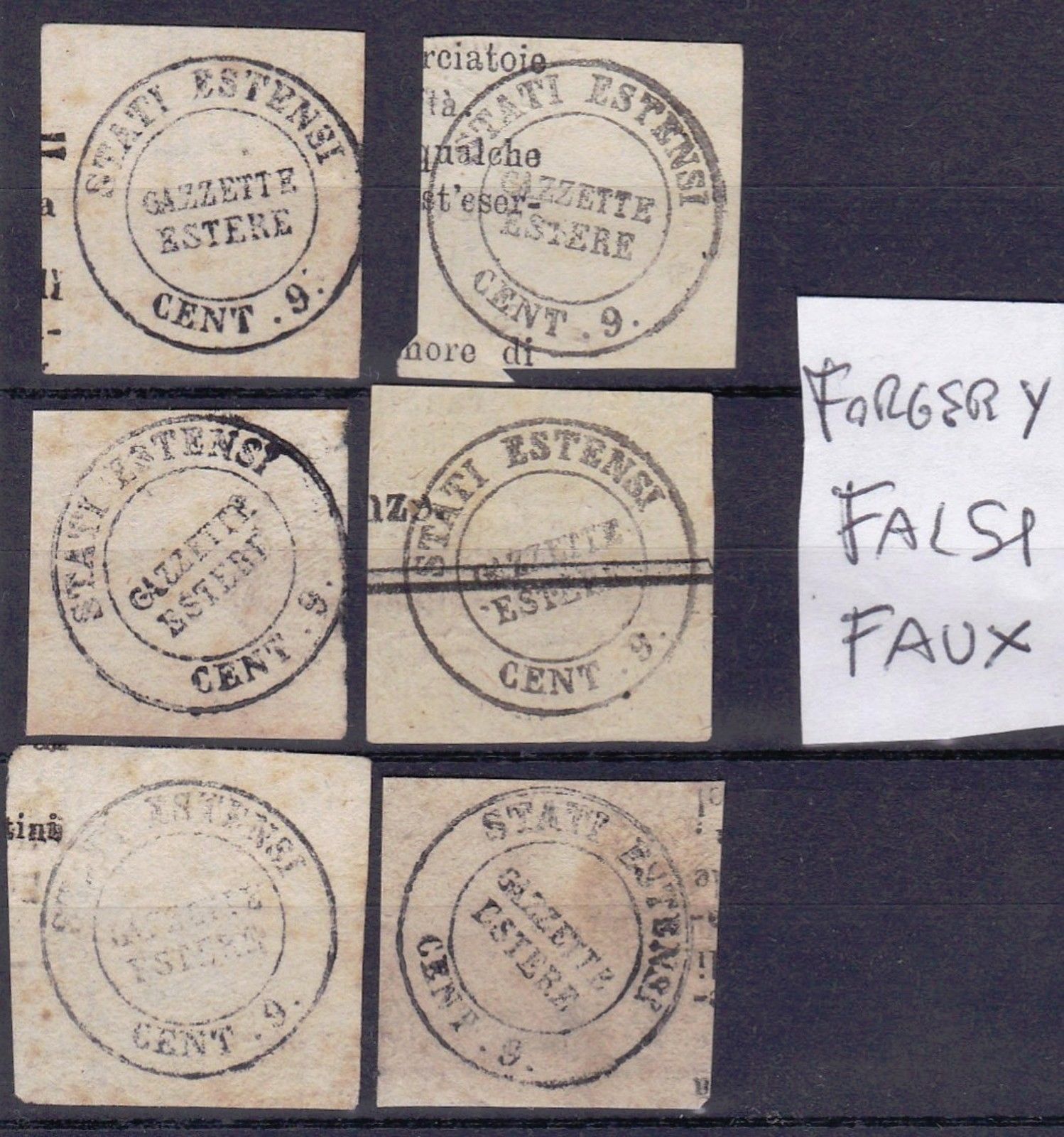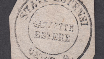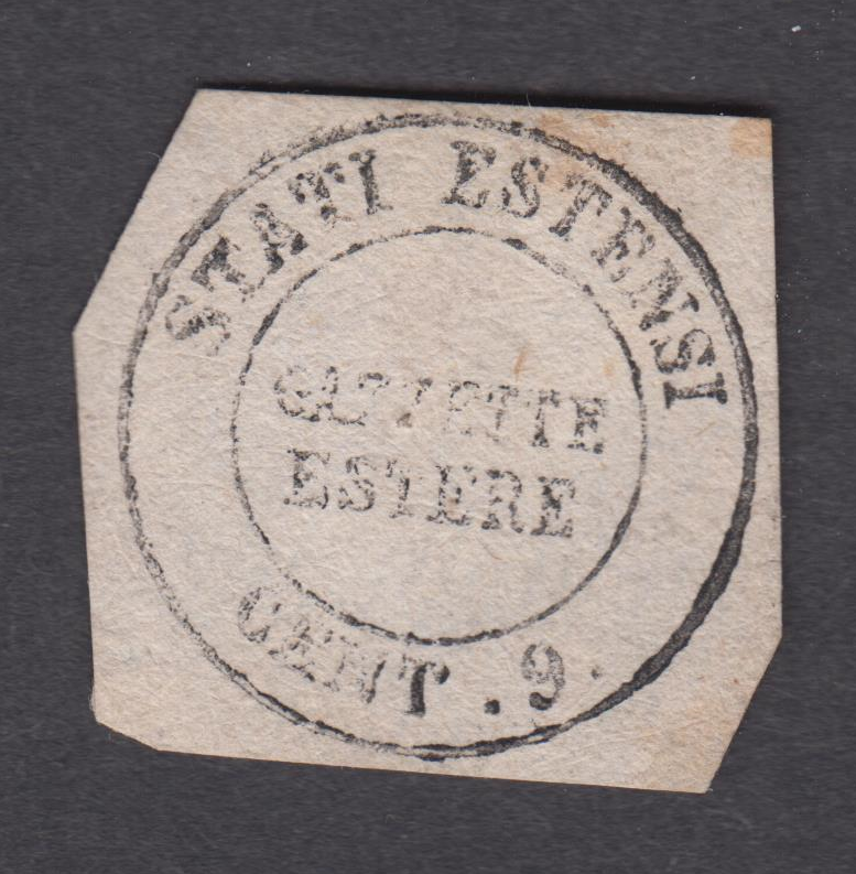 Das zweite unbekannte Stück ist ein (Zeitungs-?) Stempel (wahrscheinlich aus Modena) mit der Inschrift Stati Estensi, Gazette Estere, Cent 9