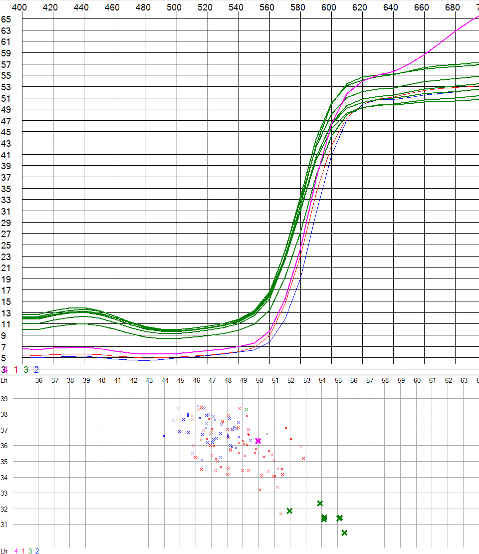Zur Illustration mal meine Kurven. Ich benutze ein Spektrophotometer, das von 360 bis 700 nm aller 20nm die Intensität des reflektierten Lichts misst und diese Werte als Zahlenkolonne ausgibt. Die Software FarbAuswertung von Wolfram Podien macht die Berechnungen und gibt alles als Kurve, Wolkenbild nach Lab/LCh Farbraum und vieles andere aus. Und speichert alles in eine Datenbank.
