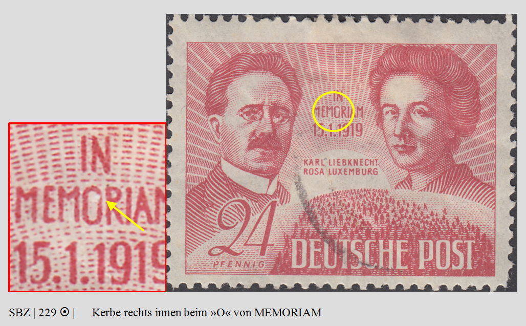 SBZ 229 | ** | weißer Fleck in den Zwischenlinien von »UT« von DEUTSCHE und Bruch im »M« und »R« von MEMORIAM