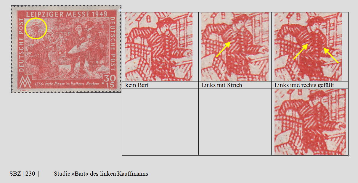 Bei 229 sind die katalogisierten Fehler II und III eigentlich winzige Fliegenschisse, die nicht in den Katalog gehören. Aufgrund des stümperhaft ausgeführten Offsetdruckes wimmelt der Druck geradezu von kleinen weißen Aussetzern oder farbigen Rasterpunkten. Die Ziffern hinter dem Namen bedeuten B = Bogen, Zahl = Anzahl im Bogen gefundener Bestätigungen, ° = Lagerbuch + Anzahl. Rot ist noch nicht ausreichend unterlegt, grün ausreichend oft im Bogen bzw. als Einzelmarke gefunden, lila dazwischen