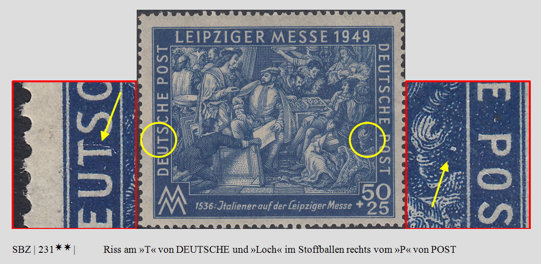 SBZ 231 | ** | Riss am »T« von DEUTSCHE und »Loch« im Stoffballen rechts vom »P« von POST