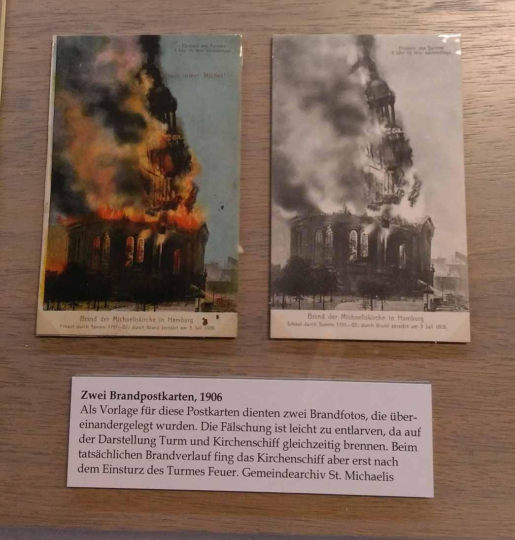 Ich komme mal wieder zurück in ein Museum, in die Krypta des Michel, in der die Geschichte des Hamburger Wahrzeichens dargestellt ist. Die Hauptkirche St. Michaelis ist 1906 abgebrannt. Fixe Photographen haben nicht nur den Brand im Bild dokumentiert, sondern auch Postkarten mit der brennenden Kirche aufgelegt. Dabei hat man den Brandverlauf auch schon mal etwas "gerafft" dargestellt (sozusagen Fake News à la Anfang des 20. Jahrhunderts).